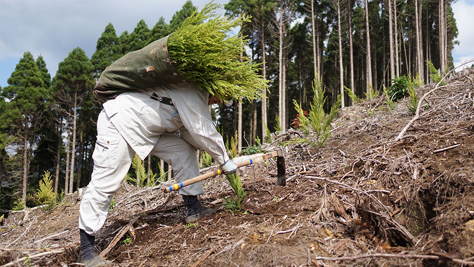 組合が伐採した山には必ず再造林を行うことで「伐って、使って、植えて、育てて、また使う」持続可能な循環型林業を維持し、山の豊かさを保ちます。適切に整備・管理された健全な森林があることで、空から降った雨がゆっくりと海まで流れ、土砂災害の発生抑止や大規模化を防止します。