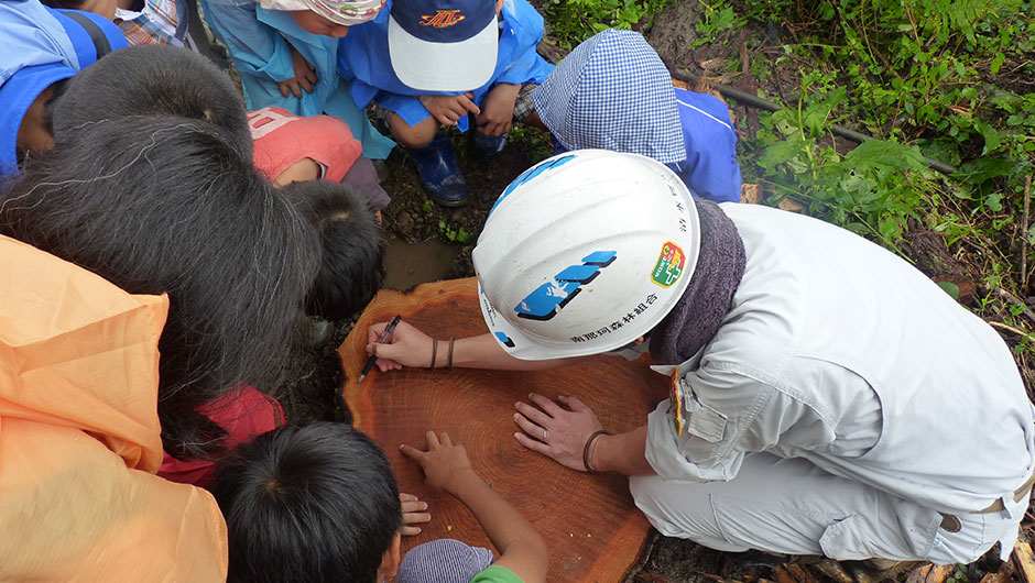 小学校・中学校で、森林・林業に関する出前授業、中学校・高校生を対象とした林業現場体験学習を行っています。地域の森林・林業の状況を伝えながら実際に体験してもらうことで、「木を伐ること、木を使うこと」の大切さを子供たちに知ってもらいます。小さい頃から森林や木製品に親しみを持ってもらい、次代の林業を担う人材づくりや、森林・林業の発展を応援してくれる人を増やす活動です。